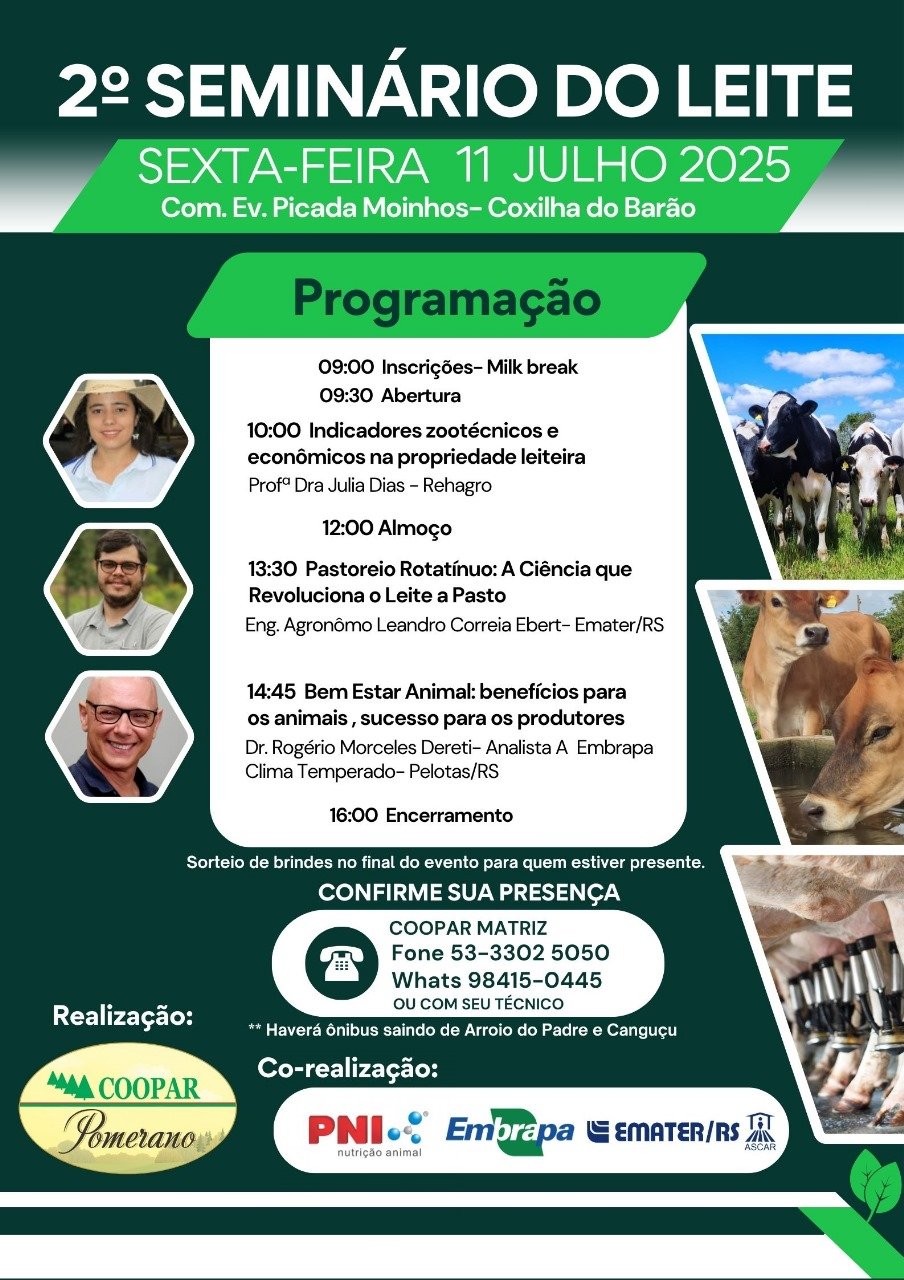 A COOPAR/POMERANO, juntamente com as Co-realizadoras: PNI – nutrição animal, EMBRAPA e EMATER/RS – Ascar e seus parceiros, Altech , Raizar, MSD – Saúde Animal, SELECT SIRES, SEMENTES agroceres, Intersul – VET e PET, SEMEX, Duagro – SOLUÇÕES SUSTENTÁVEIS – BARENBRUG, JA Saúde Animal, UNIFERTIL – O FERTILIZANTE DA NOSSA TERRA, DIAMAJU e CRESOL, convidam você associado para o 2⁰ SEMINÁRIO DO LEITE, uma iniciativa que visa compartilhar conhecimentos e experiências.